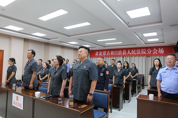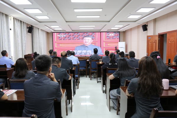 旌旗猎猎展雄风,步履铿锵扬国威。为教育引导广大干警铭记历史、缅怀先烈、珍爱和平、开创未来,进一步传承红色基因,激扬爱国情怀,凝聚奋进力量,9月3日,肃北县人民法院组织干警集中观看纪念中国人民抗日战争暨世界反法西斯战争胜利80周年大会直播盛况,认真聆听了中共中央总书记、国家主席、中央军委主席习近平在阅兵式上发表的重要讲话。全体干警在沉浸式体验中感受祖国的强大实力,在精神洗礼中坚定司法为民的初心使命。